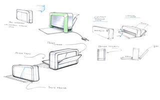 Printers tend to take up a lot of desk space and are quite complicated to store away. The idea was to cater for a modern freelancer who works from home, storing their printer on a shelf to take down and use occasionally. In this concept the printer has all its cables integrated and stands upright, taking up as little space as possible.